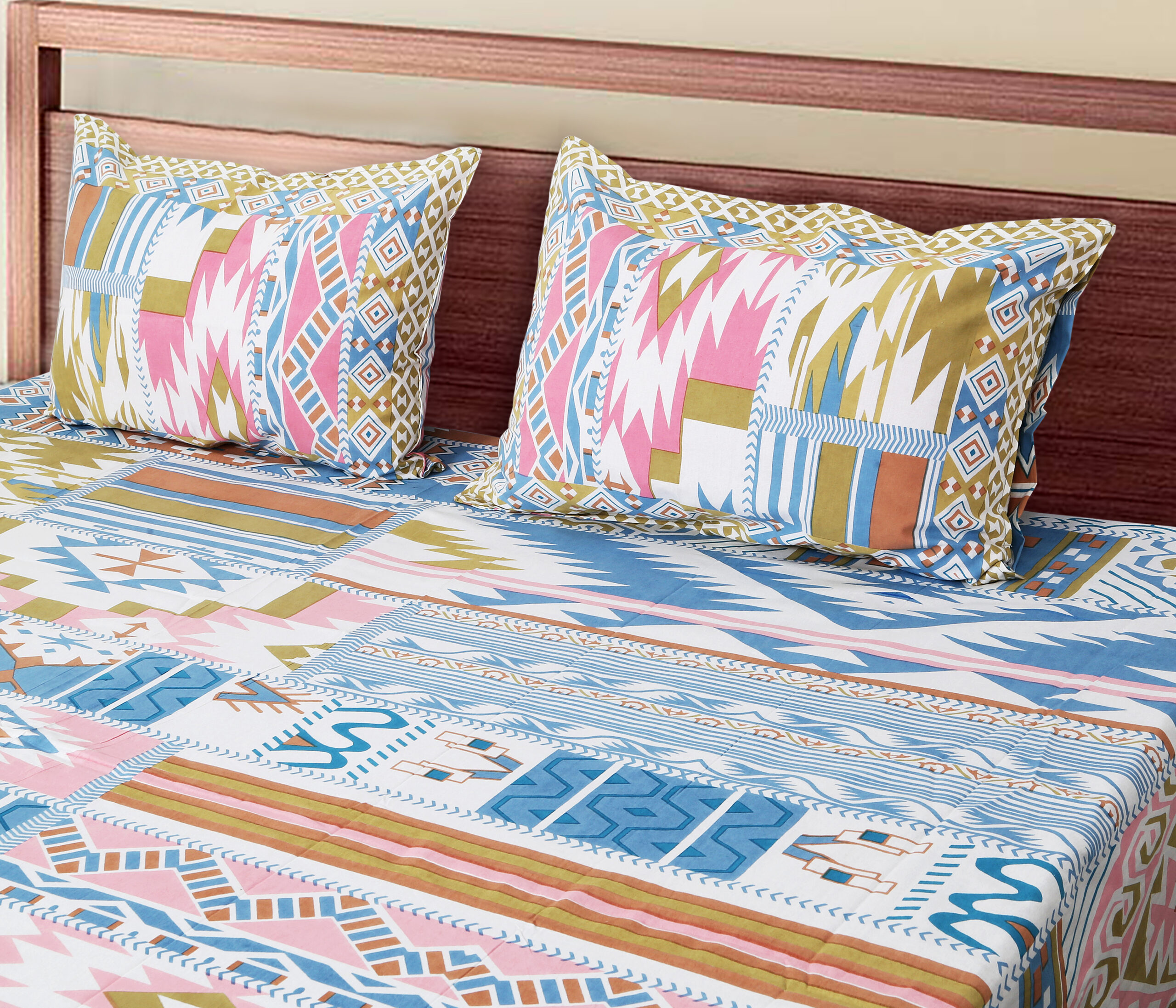 Elevate your bedroom with our premium Jumbo Size Bedsheet Set, featuring two matching pillow covers. Made from 100% Cotton Autoloom Fabric, this set promises superior comfort, breathability, and a luxurious feel. The jumbo-sized bedsheet (108 inches x 108 inches) is perfectly stitched on the sides for added durability and a neat finish. Each set includes two zipper pillow covers (43 cm x 69 cm / 18 inches x 27 inches), offering a secure fit and a polished look.